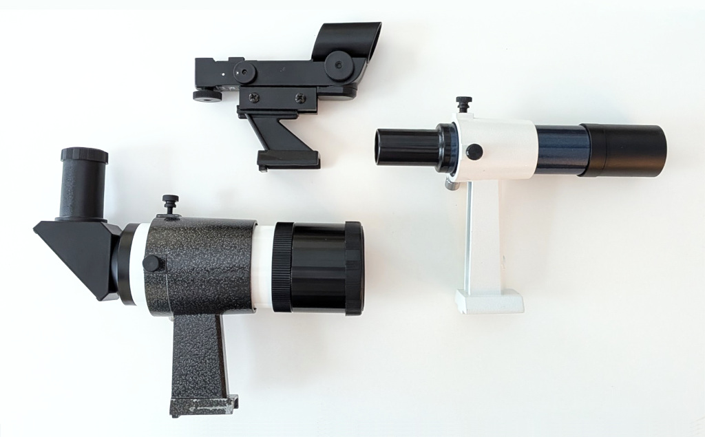 Telescope finders and finderscopes (clockwise, from top): Red dot finder, 6×30 straight-through, 8×50 RACI